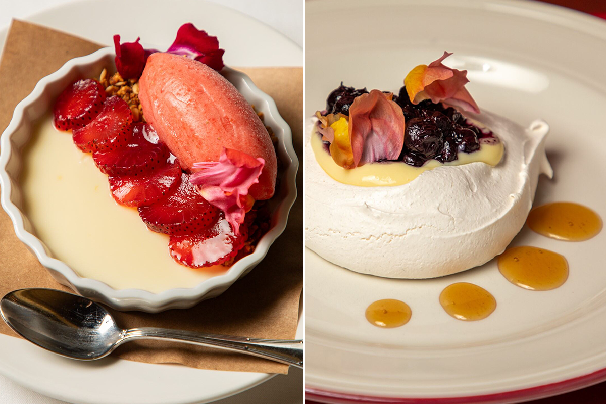 For the restaurant’s rich-but-delicate Lemon Posset—a loosely set pudding made from simmered cream and sugar and combined with lemon juice—Fallman tops the dish with a hazelnut-oat crumble and a quenelle of local berry sorbet. But there’s also a surprising finishing touch that takes inspiration from another section of the menu: the cocktails. The posset is topped with berries compressed in gin and herbs.