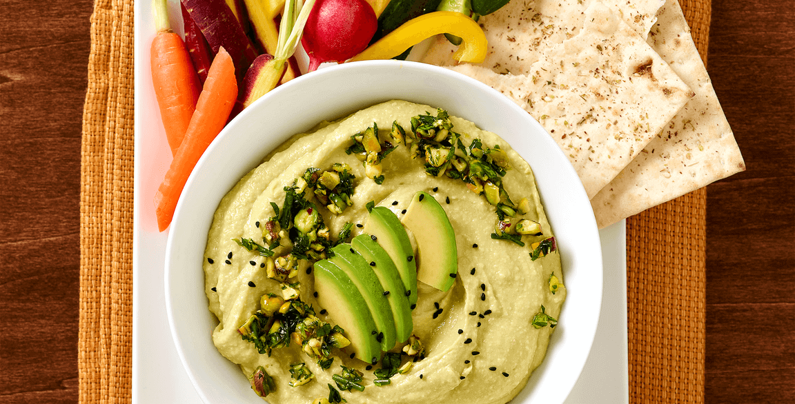 A creative take on hummus that showcases regional and seasonal bounty, the California Avocado Hummus with Pistachio Salsa Verde at Farmshop in Santa Monica, Calif., features California Avocados blended into the chickpea base, and is topped with a pistachio and herb blend for a bright and textural finish.