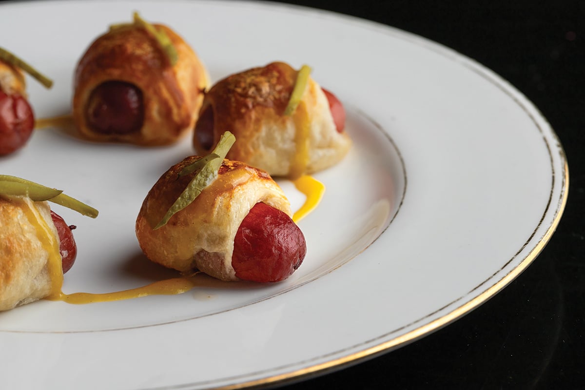 Las Vegas, blends luxury with nostalgia in its Pigs in a Blanket, featuring a Wagyu beef hot dog paired with honey mustard and cornichons.