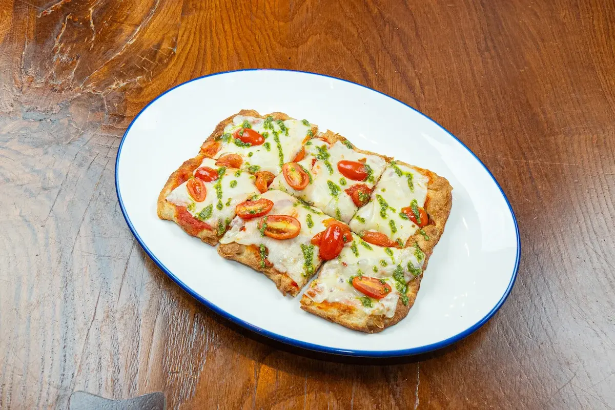More than any other section of the menu, the pinsa category strikes a winning balance between familiarity and intrigue. A rustic, airier cousin to pizza, pinsa crust is fermented for longer, lending it a distinctive texture. Leibfriend was first introduced to this Roman specialty a little over a year ago during a trip to Italy. Similarly, Rittmiller discovered it while researching honeymoon venues in the country.
