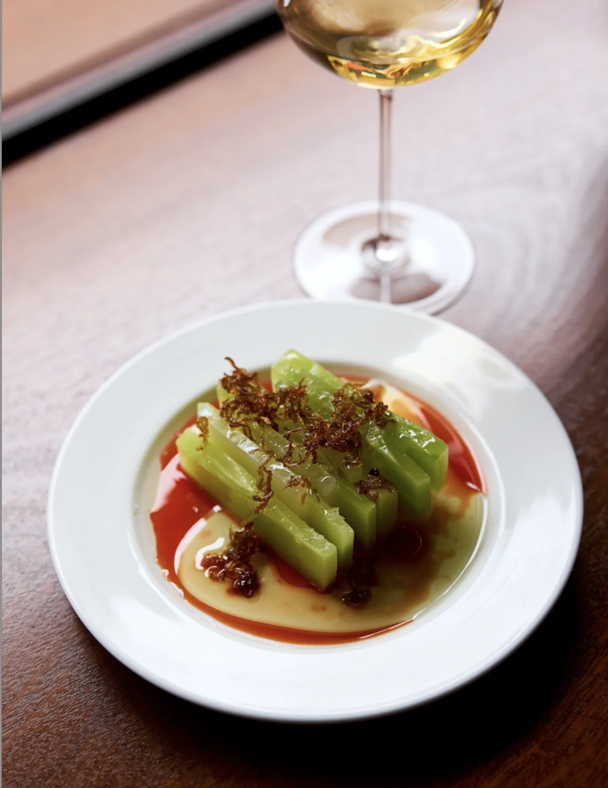 Lei in New York includes kombu jelly in its chilled celtuce salad with fried shallots and red rice vinegar, demonstrating how bouncy, slippery texture is moving into sharper focus across the menu.