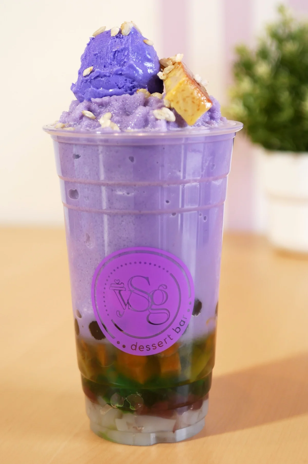 A textural jackpot, the Ube Halo-Halo layers sweet potatoes, banana, red mung beans, coconut, jellies and tapioca pearls at the base, topped with ube ice cream, crispy pinipig (glutinous rice) and leche flan—served at YSG Dessert Bar in Worth, Ill.