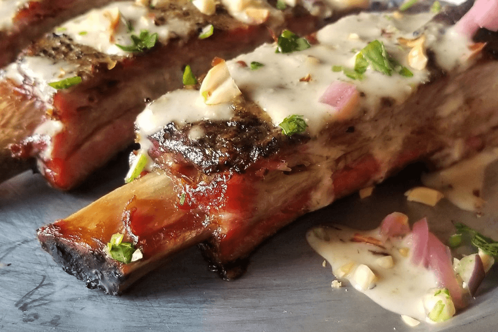 Chef and owner John Bates of Austin’s InterStellar BBQ (#2 on Texas Monthly’s list of the best barbecue in the state) takes creamy white barbecue sauce in a new direction for his Coconut White BBQ Sauce. Born out of an initial idea to swap out the horseradish often found in white sauce for wasabi, Bates doubled down on Southeast Asian flavors like coconut for the final sauce, served it over pork ribs garnished with crushed peanuts, cilantro, pickled onions and lime.