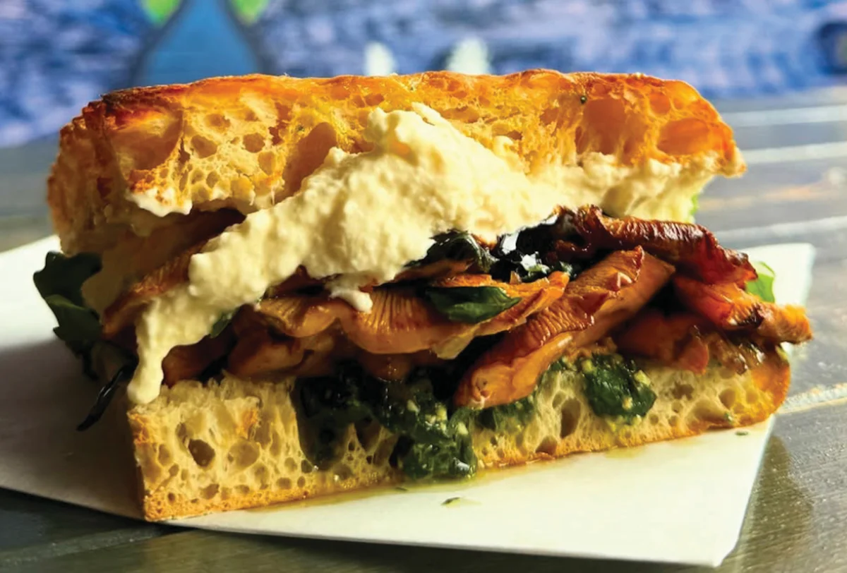 Credit: Fortuna At Fortuna in Seattle, premium ingredients like pesto, stracciatella cheese and marinated mushrooms find a happy home layered between slices of schiacciata bread.