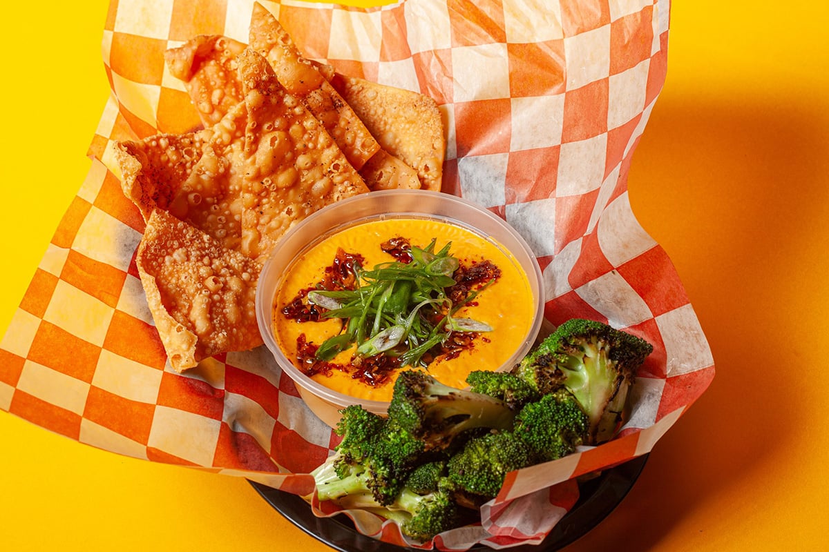 Yellow Ranger in Austin, Texas, moves queso into modern realms with its “Eventually Famous” Black Garlic Queso, which is dressed in housemade chile crisp and scallions and served with wonton chips and chilled wok-charred broccoli.