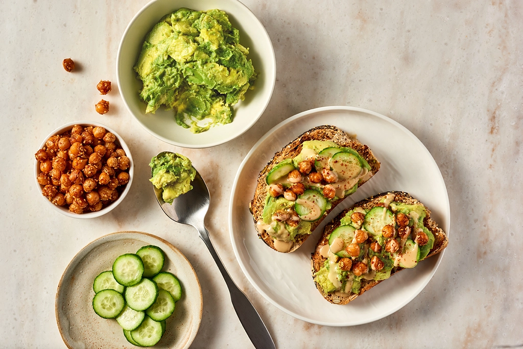 Start the morning with fun, fresh, flavor-forward new iterations of avocado toast, like this Middle Eastern version finished with fried paprika, chickpeas, tahini, pickled cucumbers and za’atar.
