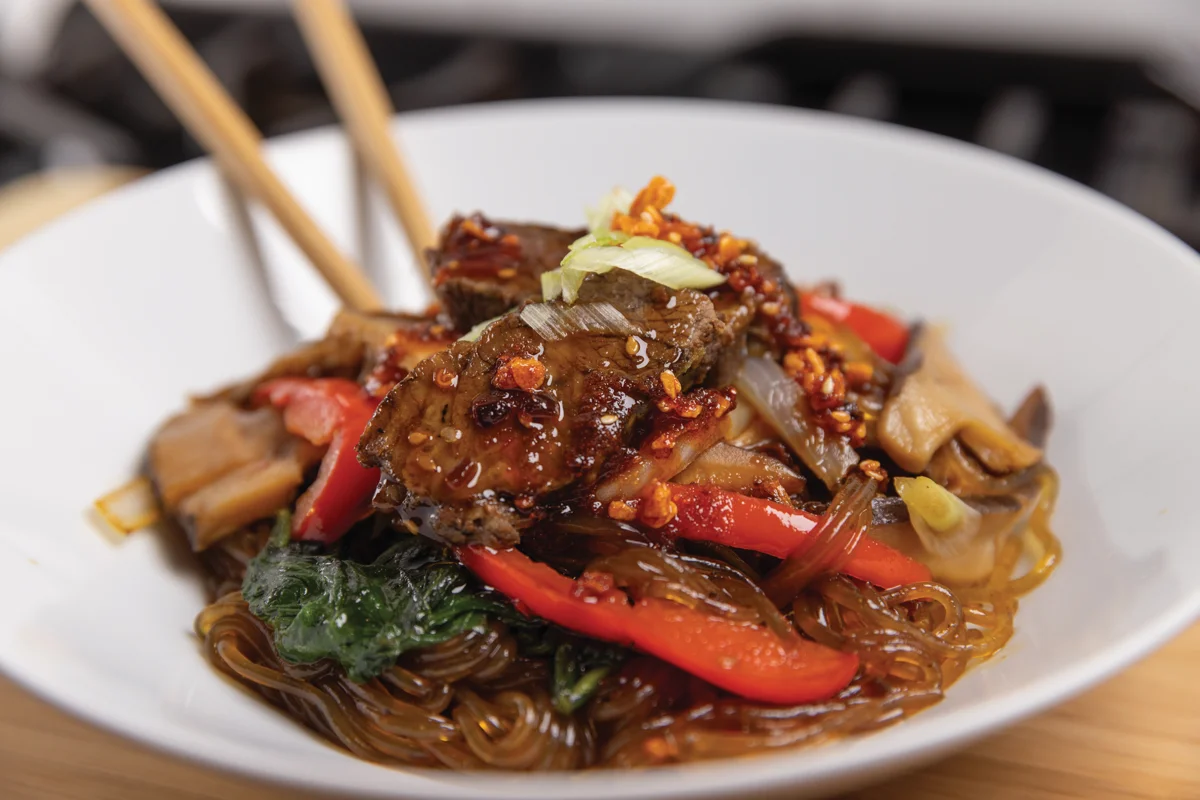 Try a Korean Japchae by stir-frying dangmyeon (sweet potato) noodles, prime ribeye, Korean barbecue sauce, vegetables, mushroom and Savor caramelized onions in sesame oil, then top with Savor crunchy garlic with chili oil.