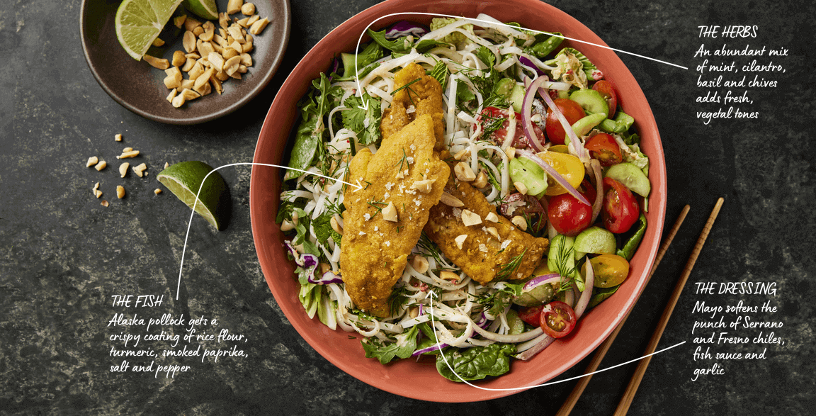 Chef Keith Brunell’s Crispy Wild Alaska Pollock Spicy Hanoi Noodle Bowl hits high marks with big flavor punches and clever textural play.