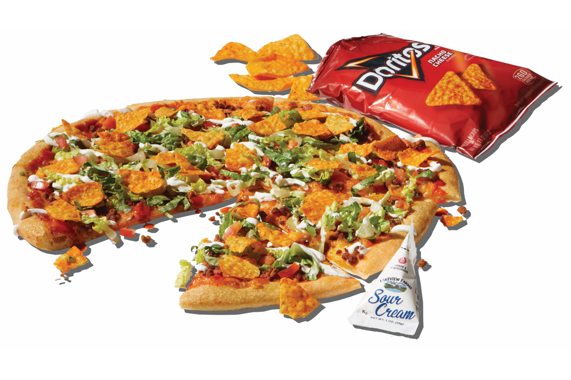 Walking Taco Topper Pizza with al pastor taco sauce, Wisconsin mozzarella and cheddar, seasoned taco meat, tomatoes, lettuce, nacho cheese-flavored Doritos and sour cream